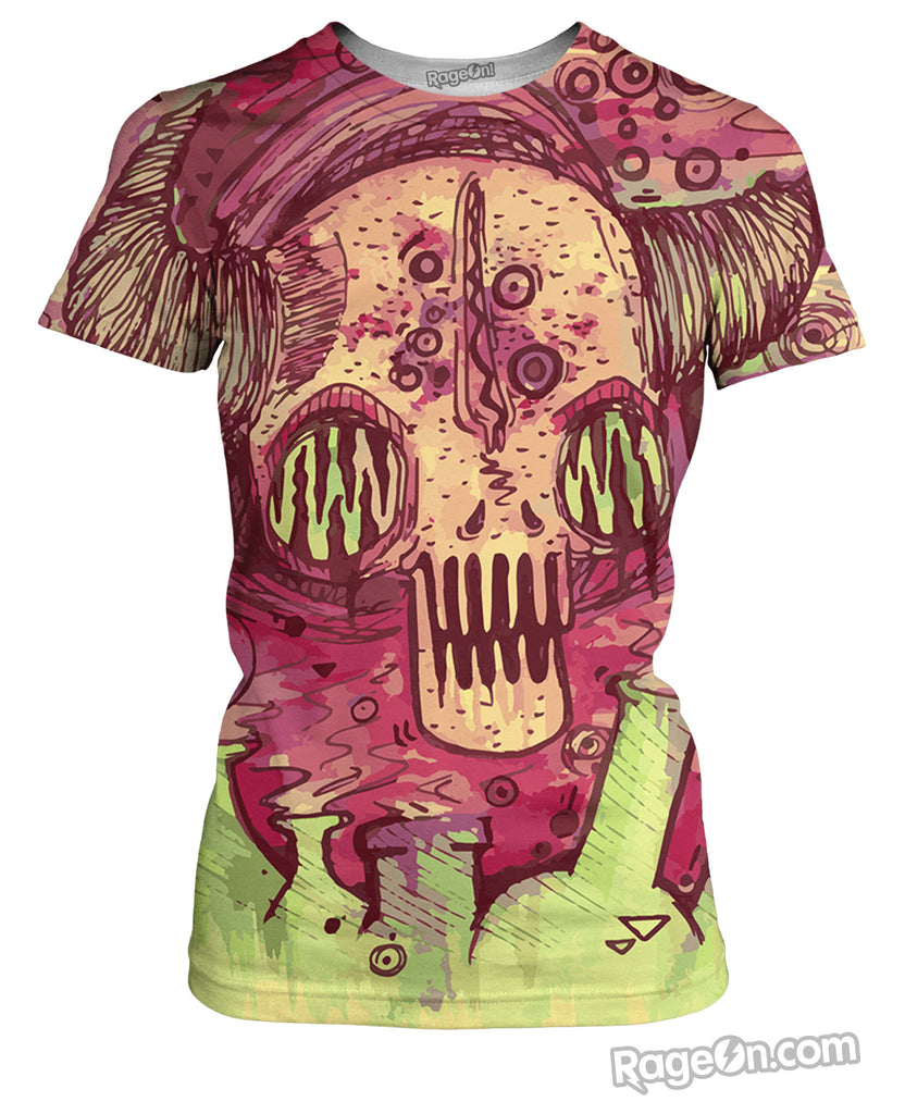Check out this Alpha T-Shirt from Let's Rage featuring a pink skull with horns in a lab with beakers full of green chemicals! This red and green all-over print design is available now, only on Rage On! Get yours today!