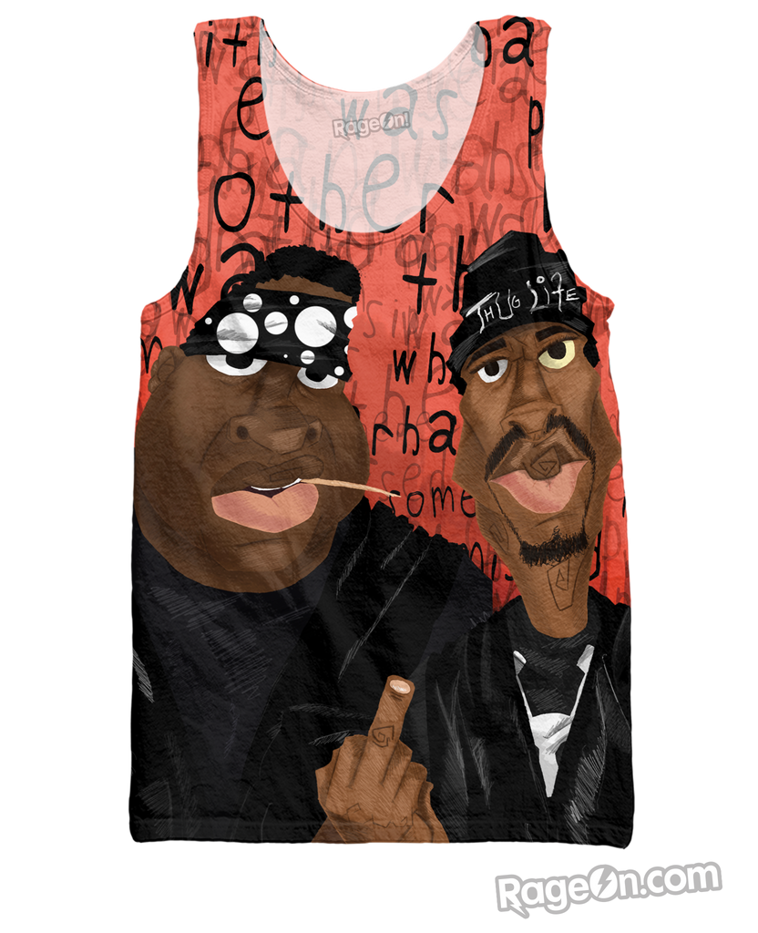 Check out this all-over print Big Pac Tank Top design by self-taught illustrator and Queens New York native, LinShuttr! This sexy tank features the notorious rap legend biggie Smalls and Tupac burnin' that loud! Have two of the greatest rappers alive on one design with this vibrant tank top design today! Only on RageOn!