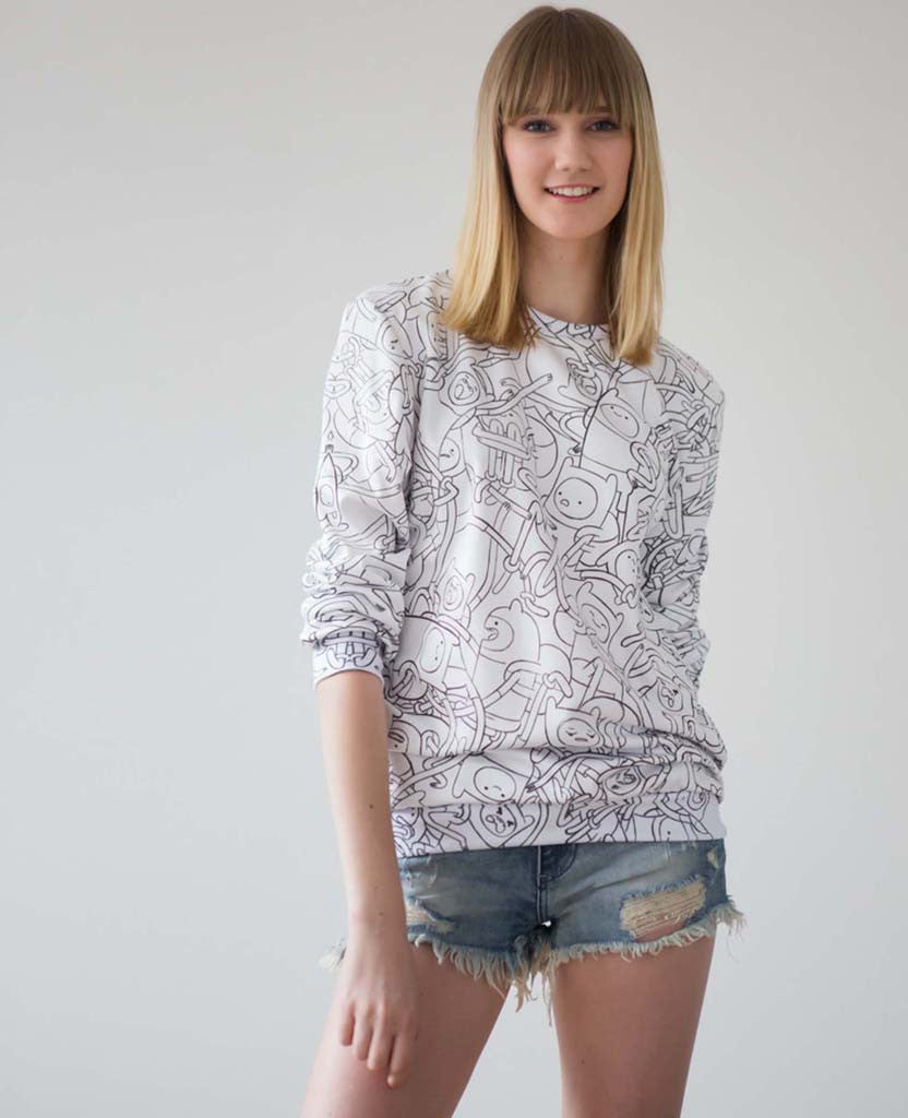 It's Finn the Human from Cartoon Network's hit show, Adventure Time with Finn and Jake! If you've wanted a all over print Adventure Time sweatshirt is a must have for any true adventurer. These are limited edition, so get them while you can!