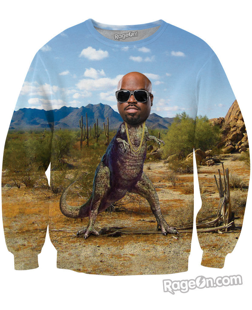 This Cee-Lo Rex Crewneck Sweatshirt is a one of a kind design by Let's Rage. Have you ever noticed that Cee-Lo has realllyyy tiny hands like a T-rex does? Well now you will! This sweet jumper is a perfect portriat of what Cee-Lo actually looks like in real life. Get this now at RageOn!!