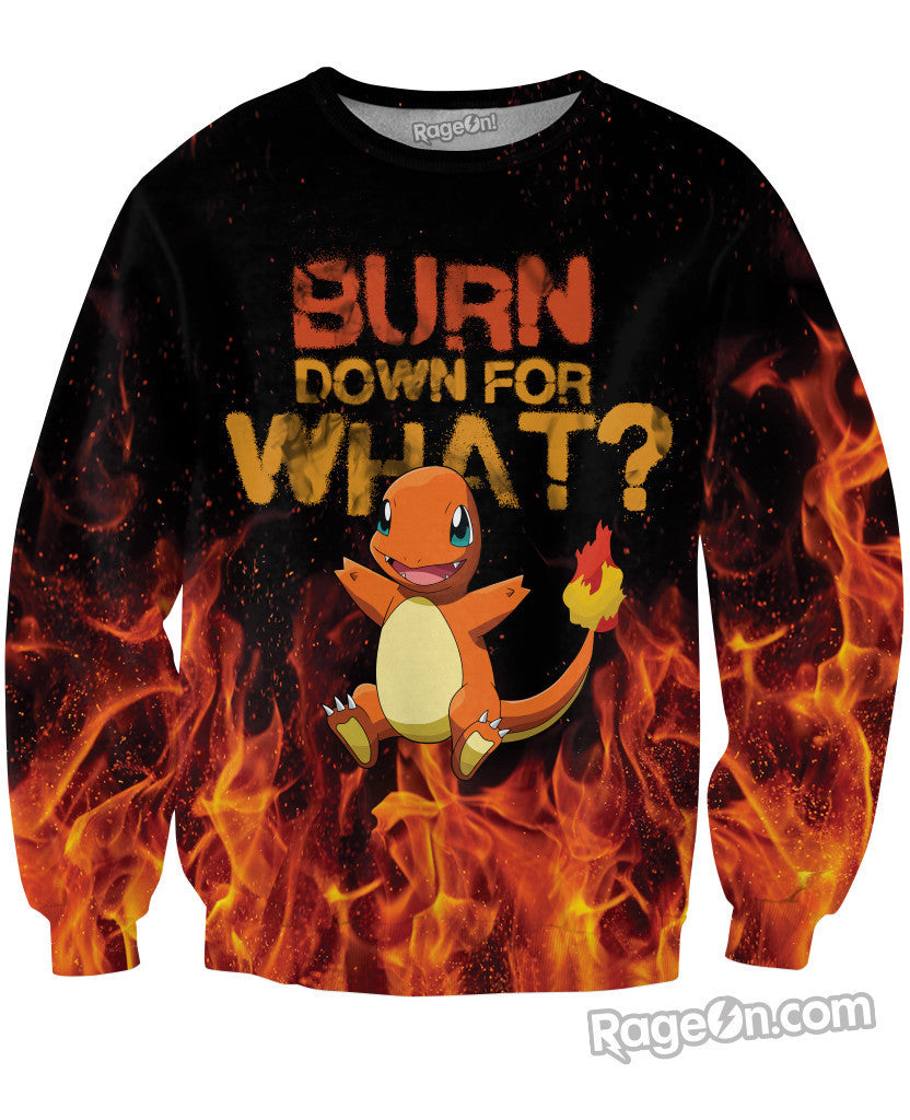Charmander has a burning question it's been waiting to ask you...BURN DOWN FOR WHAT!? Get your all-over print Charmander Crewneck Sweatshirt from Let's Rage, inspired by the original fire starter Pokemon! Only on RageOn!
