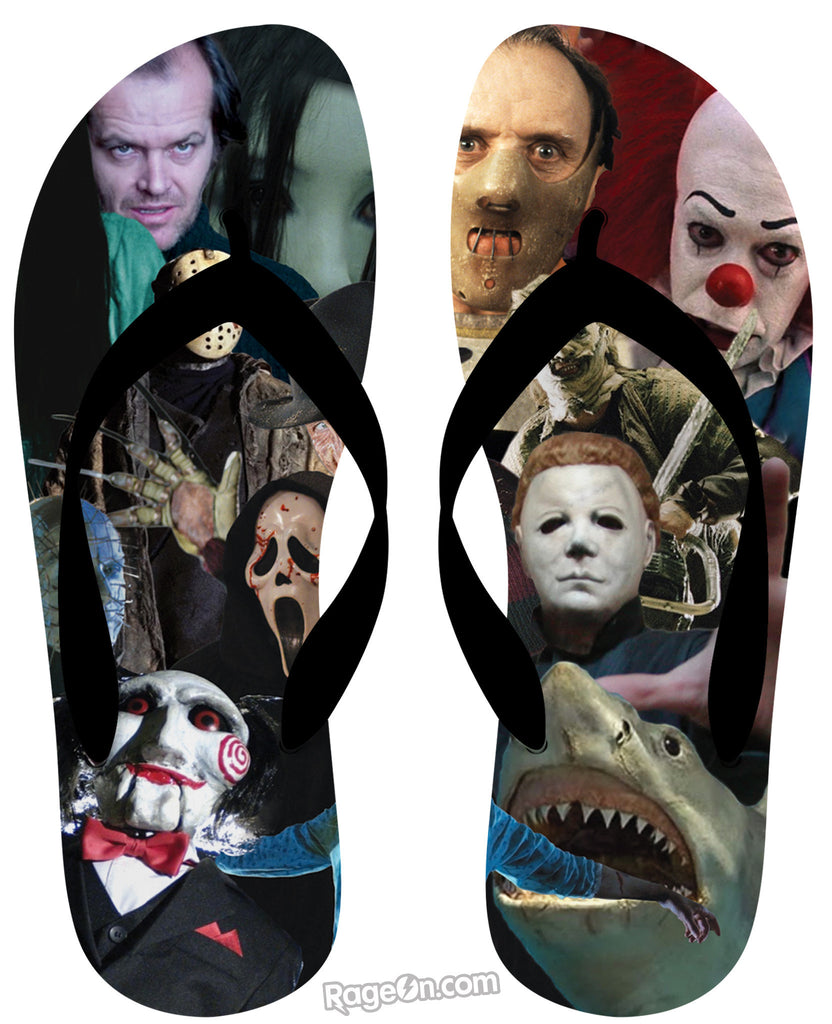 Check out this all-over print Cinema Killers Flip Flops design featuring a collage of your favorite classic horror movie killers, likeåÊMichaelåÊMyers, Leatherface, Hellraiser,åÊHannibal Lecter, It the Clown and many more! Scare your friends with design today! Only from RageOn.com!