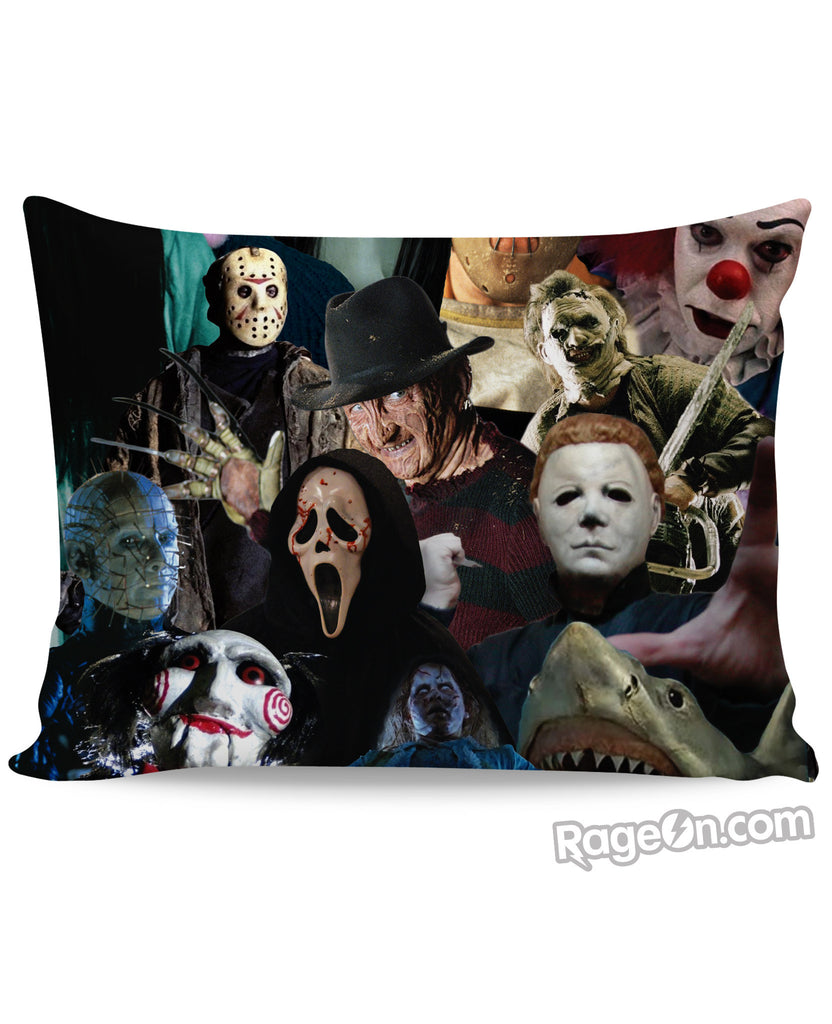Check out this all-over print Cinema Killers Pillow Case design featuring a collage of your favorite classic horror movie killers, likeåÊMichaelåÊMyers, Leatherface, Hellraiser,åÊHannibal Lecter, It the Clown and many more! Scare your friends with design today! Only from RageOn.com!