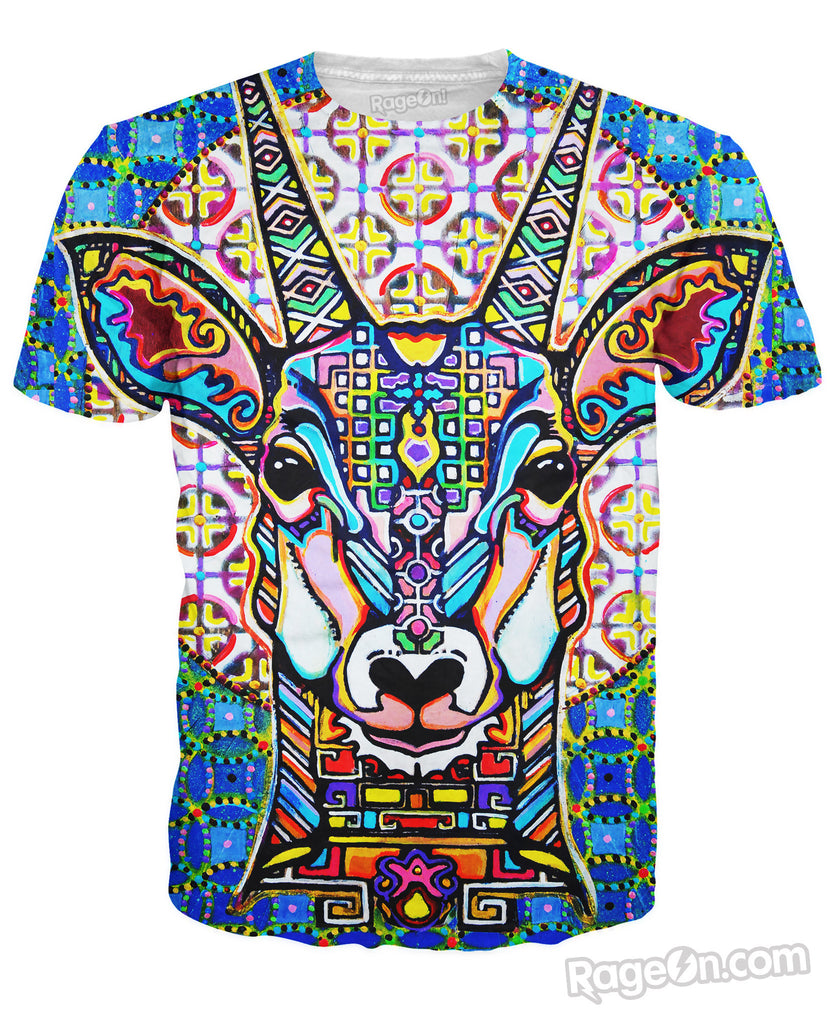 Check out this out this psychedelic Cosmoctolope T-Shirt from artist David Frank featuring vibrant colors, detailed cultural art, and a trippy antelope. This South American art all-over print tee is available now, so get your sexy shirt exclusively at RageOn!