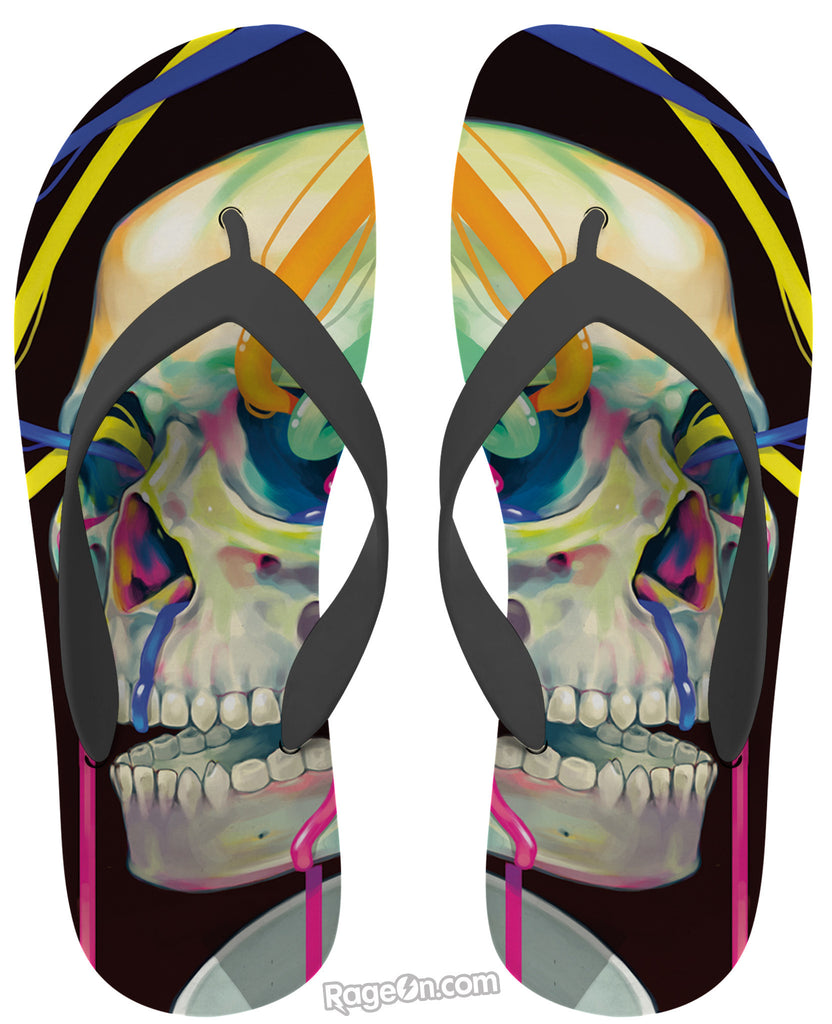 Get the Dorian Flip FlopsåÊfrom Let's Rage featuring an artistic rendering of a skull in a suit with colors flowing through it's sockets! This colorful all-over print design is available now, only on RageOn!