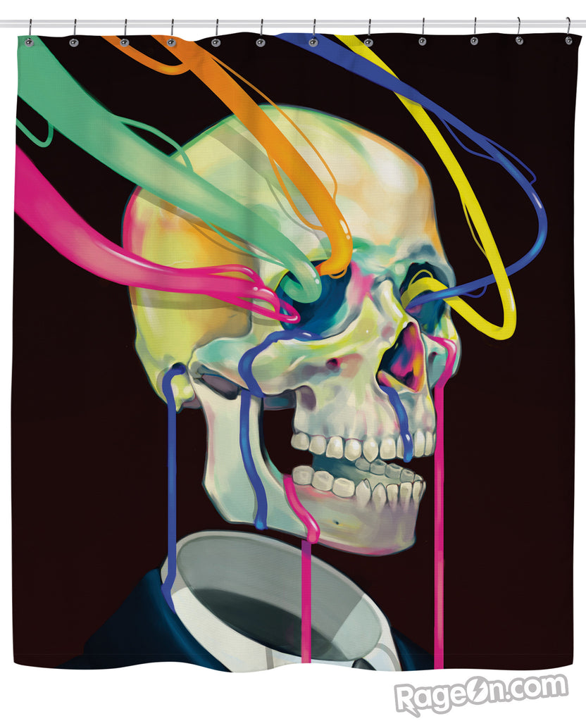 Get the Dorian Shower CurtainåÊfrom Let's Rage featuring an artistic rendering of a skull in a suit with colors flowing through it's sockets! This colorful all-over print design is available now, only on RageOn!