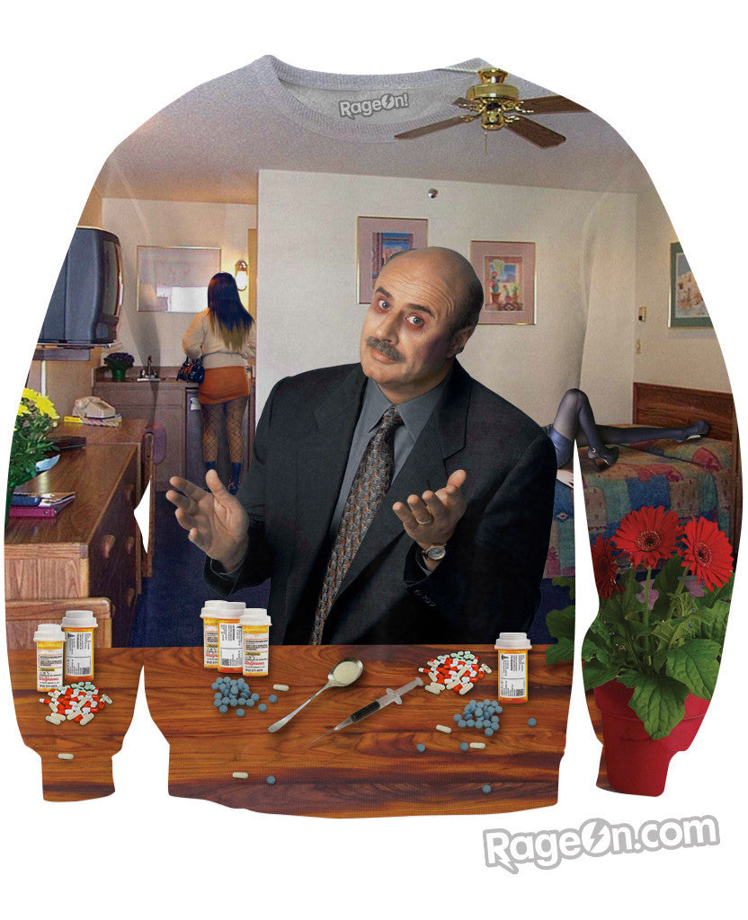 Dr. Phil will tell you himself, it's hard to not be an addict when you're surrounded by addicts. This Dr. Pill Crewneck Sweatshirt is exactly what happens when you think everyone is having more fun than you. One day you're on daytime television and the next you're immortalized on a sexy sweater surrounded by drugs and hookers. This jumper is available exclusively at RageOn!, so get yours today!