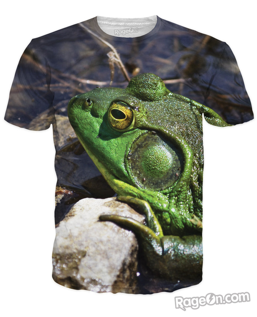 Check out this all-over print Frog T-Shirt design from our in house Wild Life brand! This sexy tee features a vibrant giant green frog chilling at his local watering hole! Support your local Wild Life and get this cozy t-shirt today, only on RageOn!