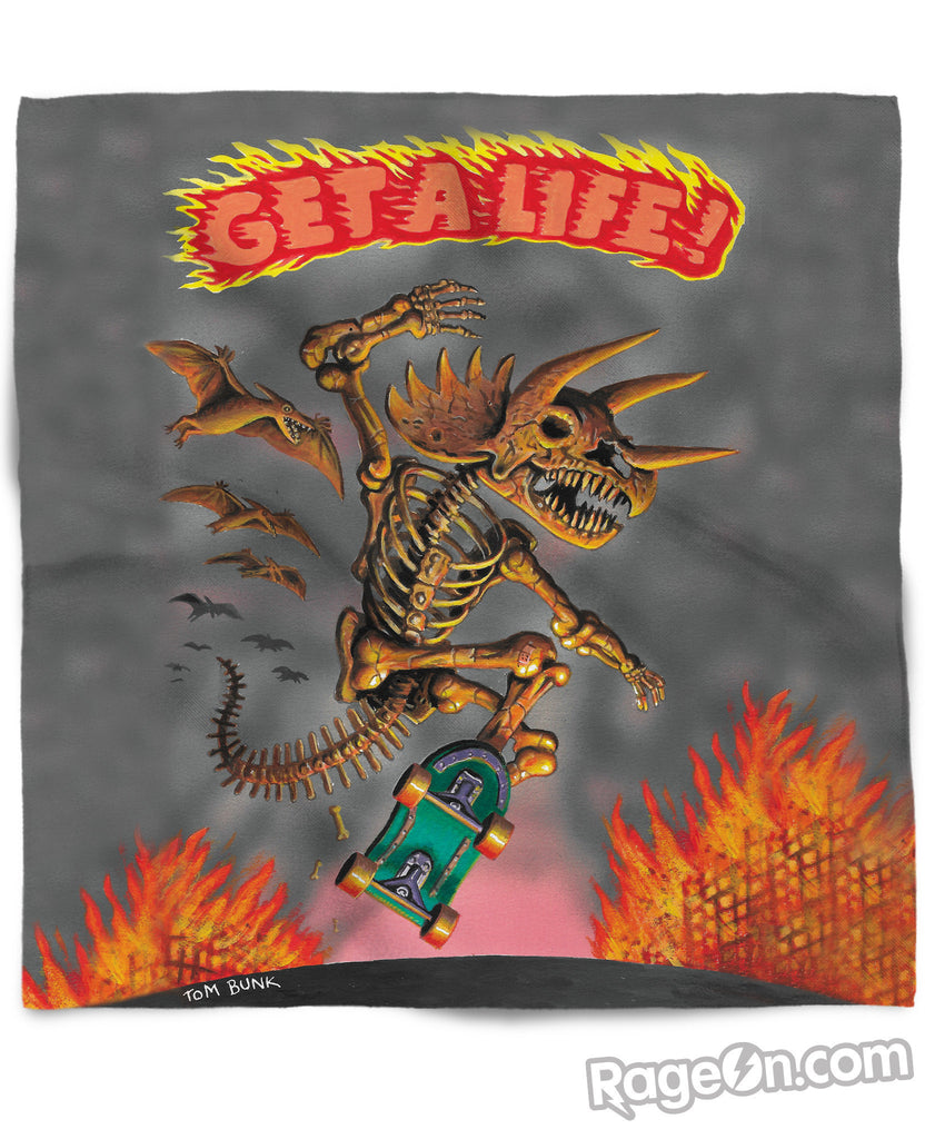 Get wild with the skateboarding dinosaur skeleton on our new one-sided print Get A Life Bandana,åÊcreated by Tom Bunk one of the original artists of the Garbage Pail Kids. Get this design today, only from RageOn.com!