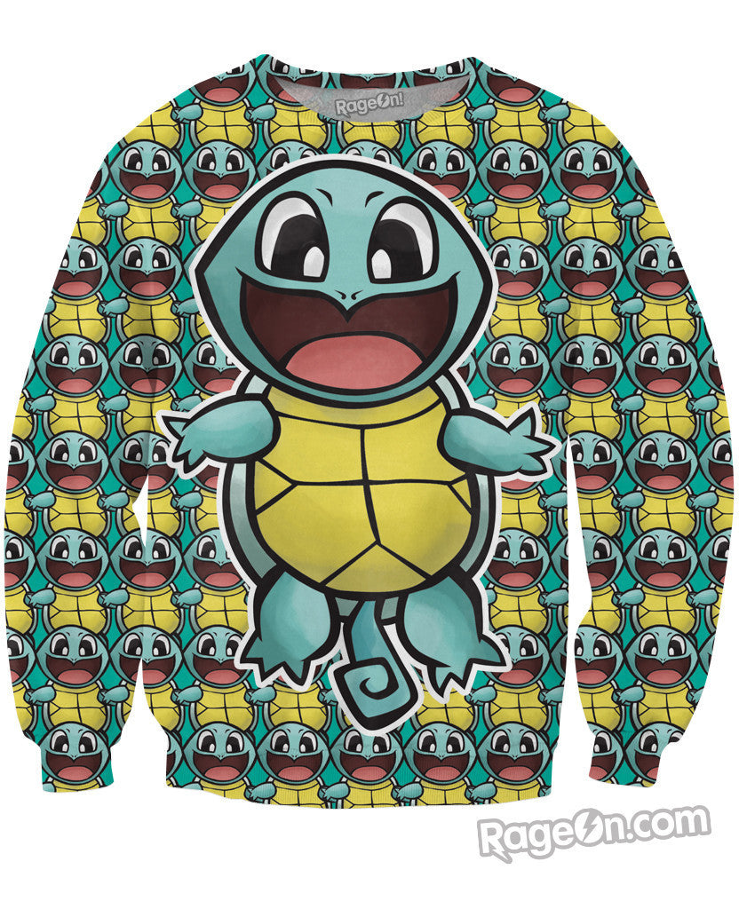 Check out this all-over print Happy Squirtle Crewneck Sweatshirt design by artist Jorden Tually! This sexy sweater features the original water type starter Pokemon, Squirtle! Let everyone know that you're are a trainer who loves water type Pokemon with this vibrant jumper today! Catch em all, only at RageOn!