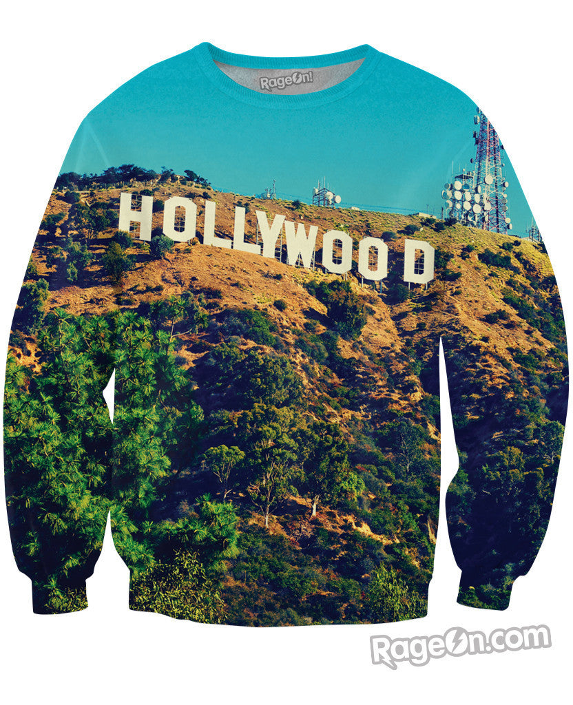 Check out this all-over print Hollywood Crewneck Sweatshirt design from our in house Classics brand! This sexy sweater features Los Angeles California's' cultural landmark and icon, the Hollywood Sign! Get this vibrant jumper today, only on RageOn!