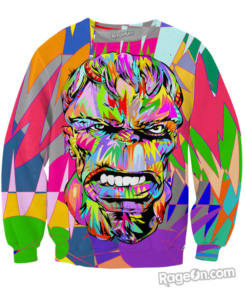 This Hulk Crewneck Sweatshirt from Technodrome1 features a pop art depiction of the Incredible Hulk! Get this colorful all-over print design today, exclusively on Rage On!