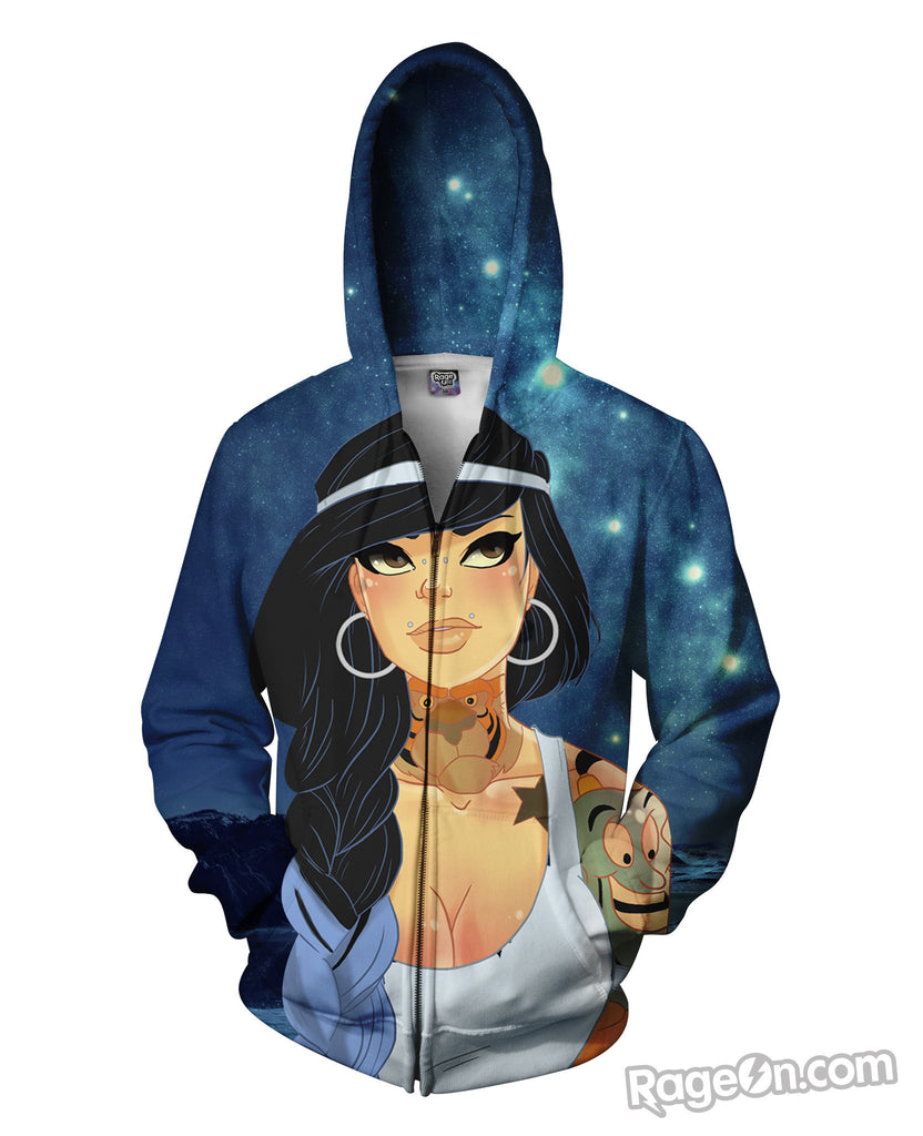 Princess Jasmine is the daughter of the Sultan of Agrabah from the Disney Classic Aladdin and has been turned into a punk rock princess by Evviart on this Jasmine Zip-Up Hoodie! This all-over print hooded sweatshirt will open up a whole new world of style in your wardrobe, so get your hoodie today only from RageOn!