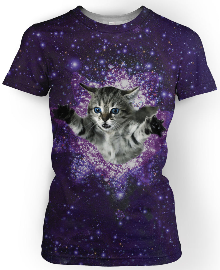 This Kitty Glitter T-Shirt features a fuzzy a little fella exploring the cat world's final frontier: Space! This adorably, wacky all-over print kitten sexy tee is available only from Rage On, so get your shirt today!