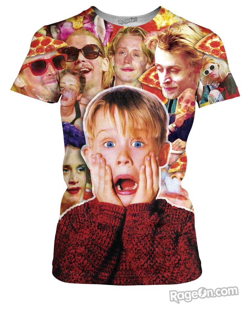 Check out this Macaulay Culkin Pizza Party Monster T-Shirt from Let's Rage! This all-over print features the home alone star as a child and adult in a collage with pizza! Get yours now, only on Rage On!