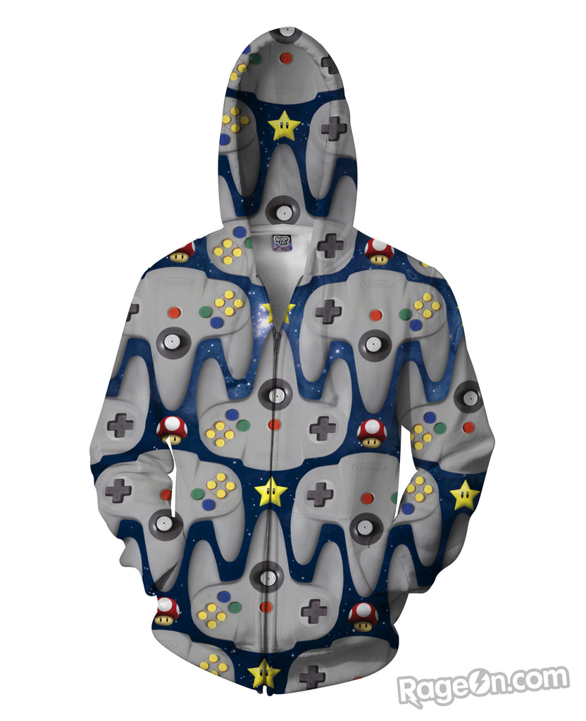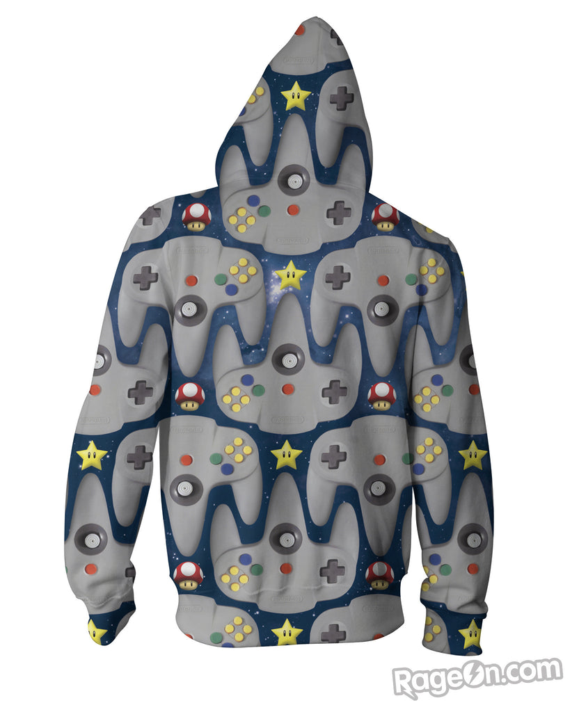 Check out this all-over print N64 Zip-Up Hoodie from our in house video gamed inspired 8bit brand! This sexy zip-up is every 90s kids dream! This vibrant hoodie features the famous N64 controller, the power-ups from the Mario series and its in space! Relived your childhood now and get this zip-up hoodie design today! Only on RageOn!