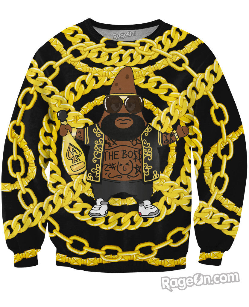This Patrick Ross Crewneck Sweatshirt from Artoon depicts Patrick from SpongeBob SquarePant's as Hip Hop fashion killa Rick Ross! Get this all-over print design today, exclusively from Rage On!