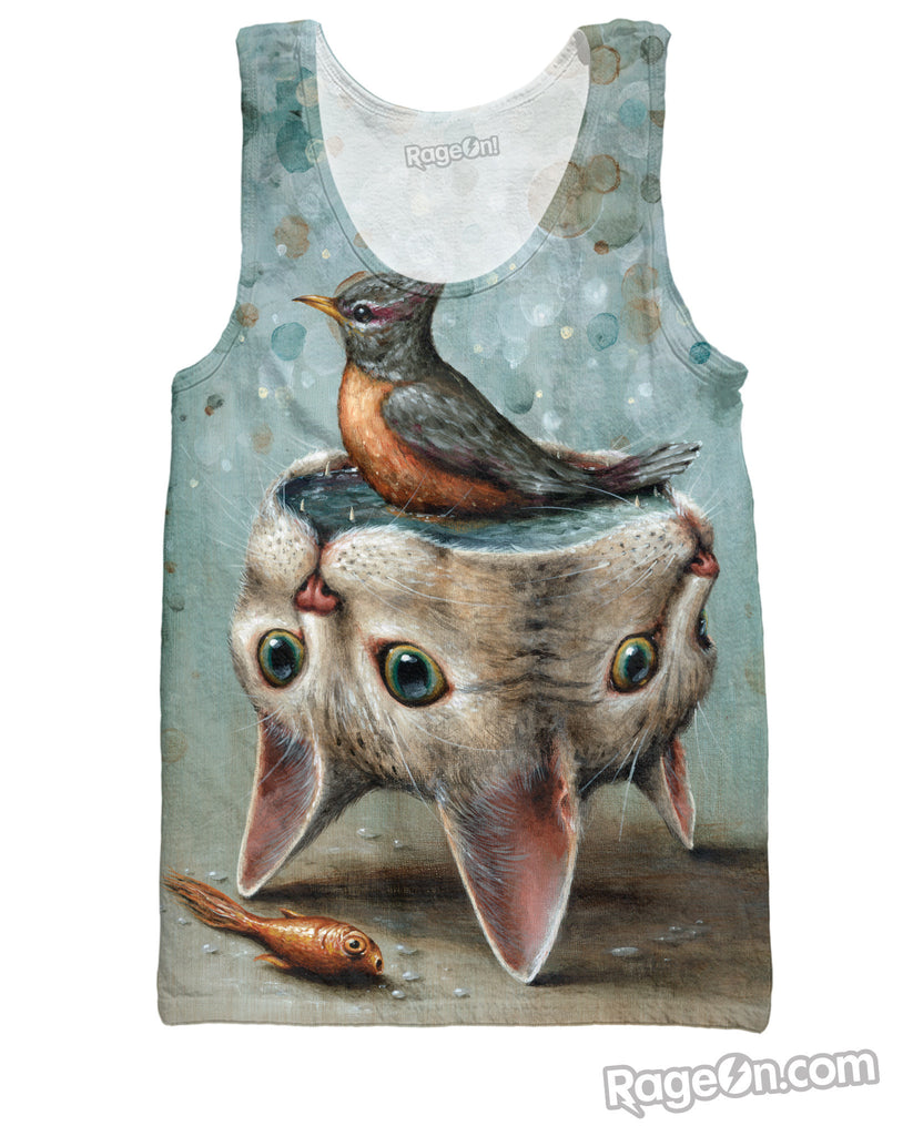 What happens when the food chain gets out of whack probably looks a lot like this Perilous Puddle Tank Top by Jason Limon. When a bird kicks a fish out of it's own bowl made out of a cat's skull, it's easy to remember who is most closely related to dinosaurs. Get this all-over print tank only from RageOn!