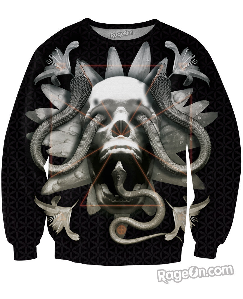 Get this sick Phantasmagoria Crewneck Sweatshirt from Trick Moranis! This freaky skull and snake themed all-over print sexy sweater is sure to keep you stylin' amongst even the darkest fashionistas. This jumper is available only at RageOn! so order yours today!