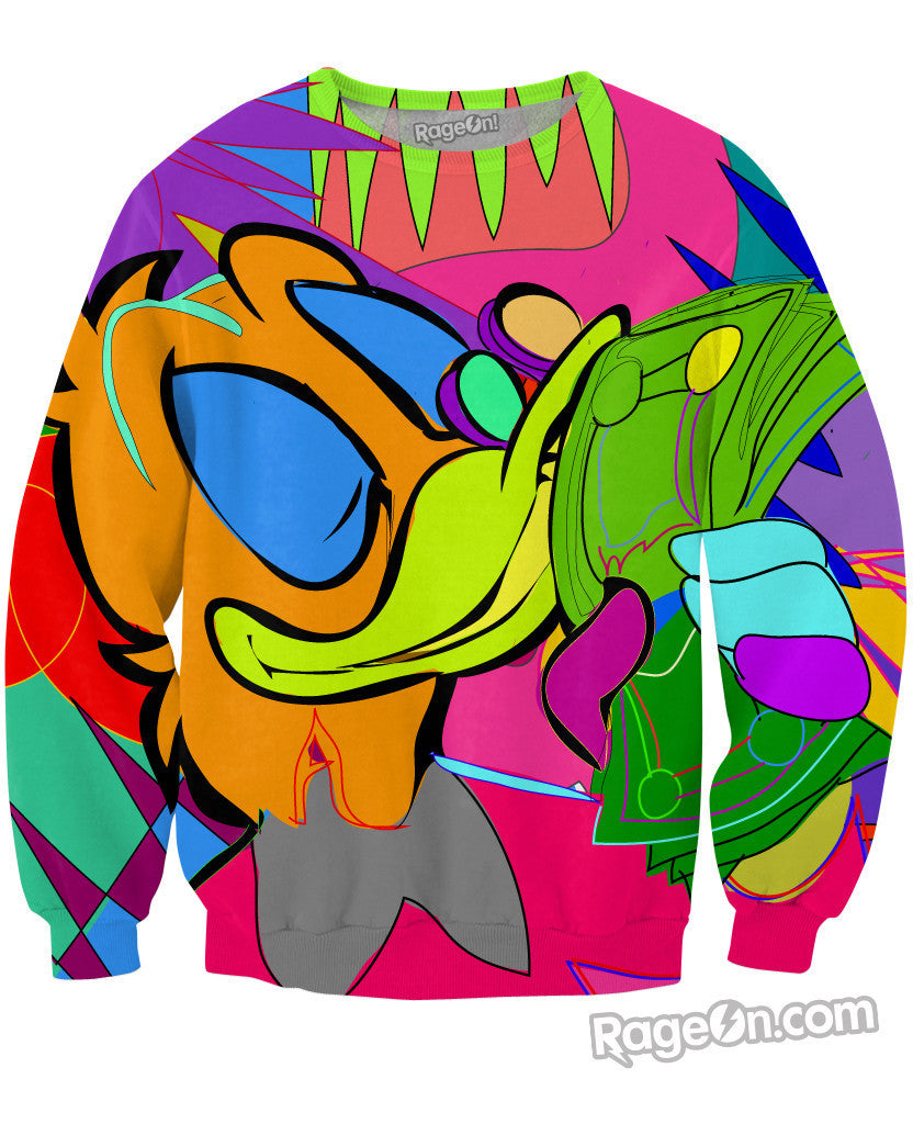 This vibrant Scrooge Crewneck Sweatshirt from Technodrome1 features a colorful depiction of the famous shrewd businessduck and noted tightwad, Scrooge McDuck. You can get this all-over print pop art sweater now, exclusively on RageOn.com!