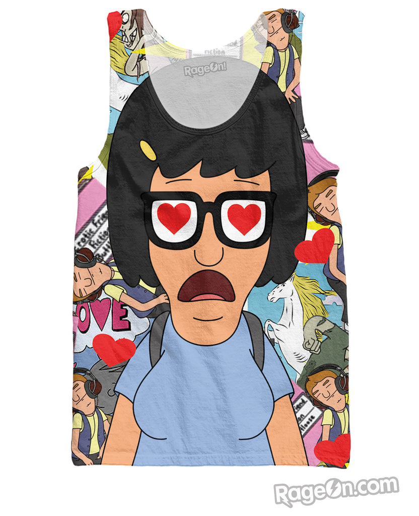 Get the Tina Belcher Tank Top from Let's Rage and take the awkward little Bob's Burgers starlet with you everywhere! This all-over print design is available now, only on RageOn!