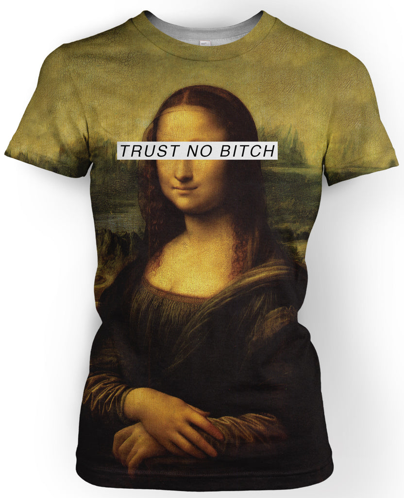 Get our Trust No Bitch Mona Lisa T-Shirt from Let's Rage! This all-over print Leonardo Da Vinci work of art is available now, only on RageOn!