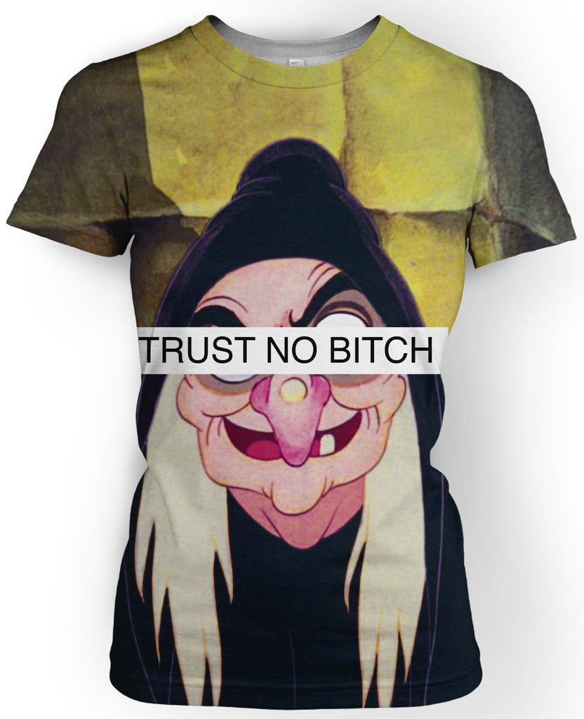 Check out our Trust No Bitch Snow White Witch T-Shirt from Let's Rage! This all-over print design inspired by the villainous old lady form ofMaleficent in Snow White with the poison apple is available now, only on RageOn!