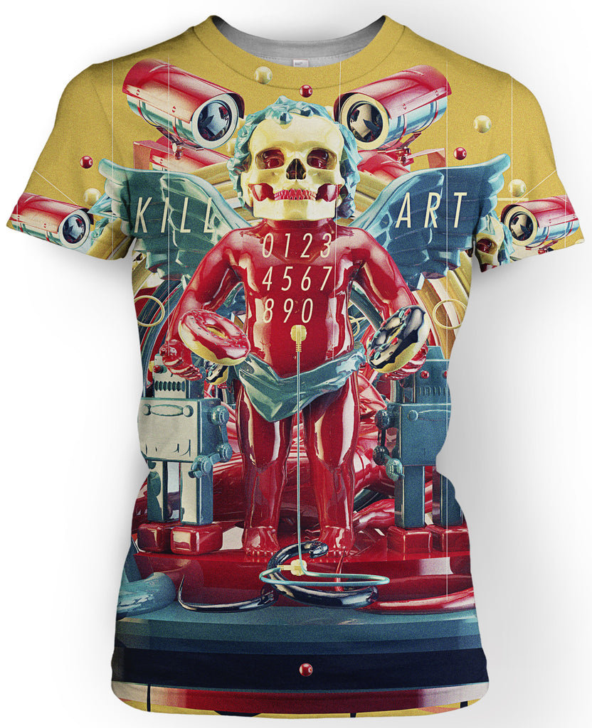 Check out this Urban Outfitters T-Shirt from Let's Rage! This all-over print design is a work of art from Antoni Tudisco and features a skeleton angel with donuts, robots, and the phrase KILL ART! Only on Rage On!